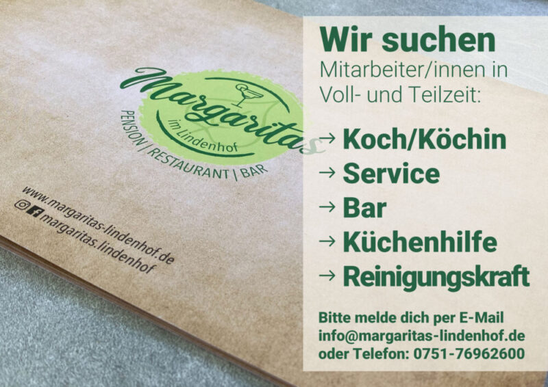 Herzlich willkommen beim Margaritas im Lindenhof. Wir bieten Ihnen unterschiedliche Speisen von verschiedenen Steaks mit Beilagen über knackige Salate, Ofenkartoffeln, Burger, Schnitzel, Käsespätzle und verschiedene Rösti-Gerichte bis hin zum Schweizer Wurstsalat.